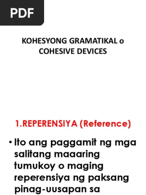 Dinaragdagan naman ang salita. COHESIVE DEVICES 1REPERENSIYA Reference Ito ang paggamit ng mga salitang maaaring tumukoy o maging reperensiya ng paksang pinag-uusapan sa pangungusap. KOHESYONG GRAMATIKAL AT URI NG PANG-ABAY Pangkat IV.