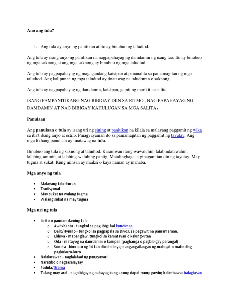 TULA Ito ay kasulatang naglalayong magpahayag sa paraan ng pananalitang may aliw-iw ito ay maaring maglarawan ng buhay at iba pa. Kilala rin ito bilang patula sa panitikan. Ito ay ang tumutukoy sa pagkakapareho ng tunog ng mga huling pantig ng mga taludtod.