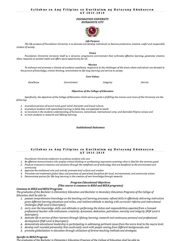 Syllabus Ang Kurikulum Ng Filipino Sa Batayang Antas Ng Edukasyon